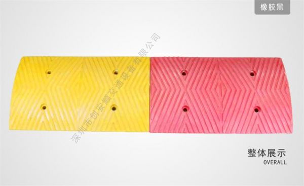 4.黑黄相间,特别醒目;每块端节上可安装高亮度的反光珠,晚上反射光线,使司机可以看清减速坡的位置;